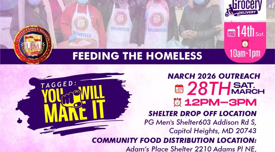 FEEDING THE HOMELESS Saturday, March 28th at 12 P.M. – 3 P.M. Tagged “You Will Make It” SHELTER DROP OFF LOCATION PG Men’s Shelter 603 Addison Rd S Capitol Heights, MD 20743 COMMUNITY FOOD DISTRIBUTION LOCATION Adam’s Place Shelter 2210 Adams PL NE Washington DC...